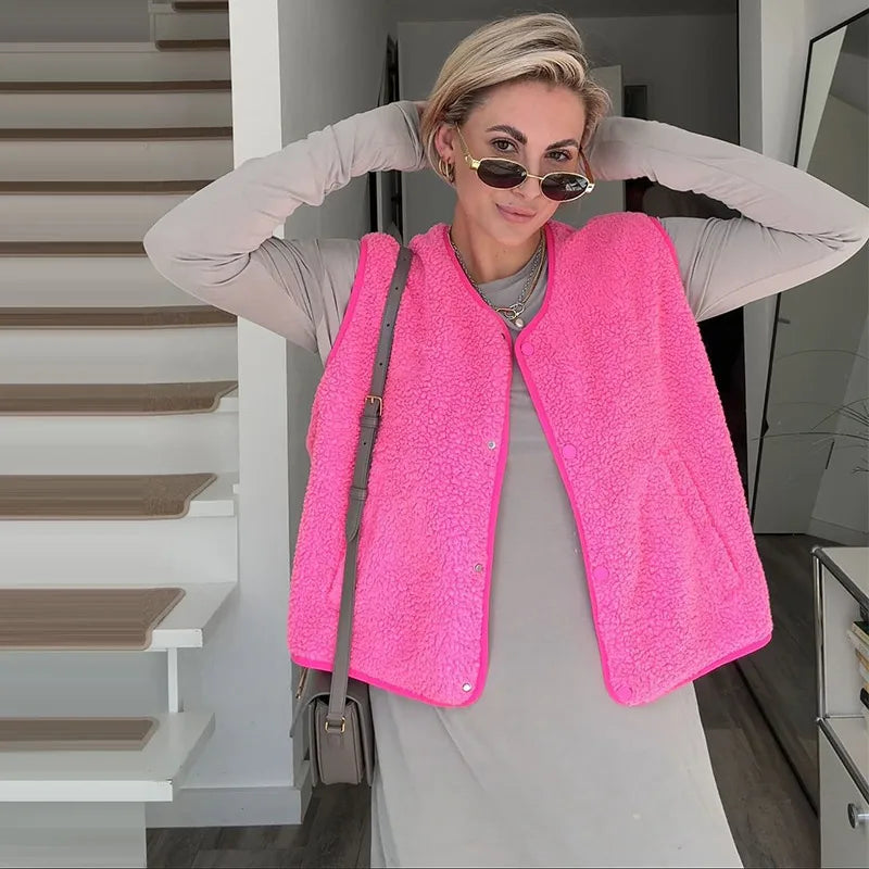 Trendy & Tijdloos! De Indy Jacket is dé musthave voor jouw wardrobe. Deze teddy bodywarmer geeft elke outfit een instant upgrade, of je nu gaat voor een casual vibe of het wat chiquer wilt aanpakken met de Indy Jacket zit je goed. Met zijn perfecte fit en luxe teddy materiaal is dit jouw go-to piece voor elke gelegenheid. Draag 'm over je favoriete sweater of combineer 'm met een blouse voor een effortless chic look. Een veelzijdige essential die moeiteloos te combineren is en deze herfst niet kan ontbreken!