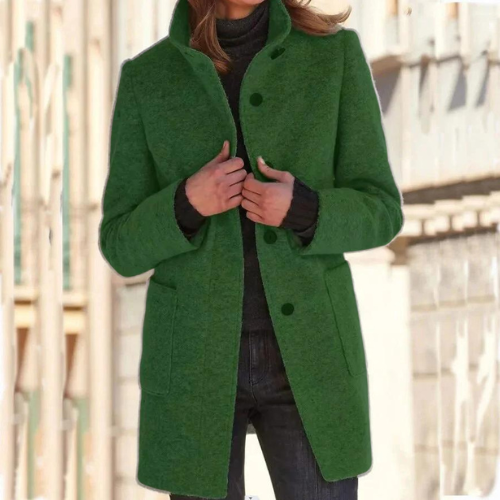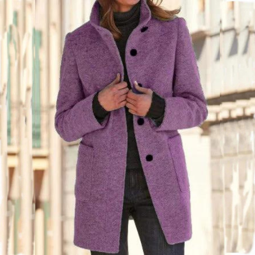 Deze damesjas combineert moeiteloos elegantie met functionaliteit. De staande kraag en knoopsluiting zorgen voor een strakke, verfijnde uitstraling, terwijl de mantel tegelijkertijd warmte biedt. De lange mouwen en effen kleur maken dit kledingstuk veelzijdig en geschikt voor elke gelegenheid, terwijl de toegevoegde zakken zowel praktisch als stijlvol zijn. Perfect om over uw favoriete outfits te dragen, is deze mantel een onmisbaar item voor de koudere seizoenen.