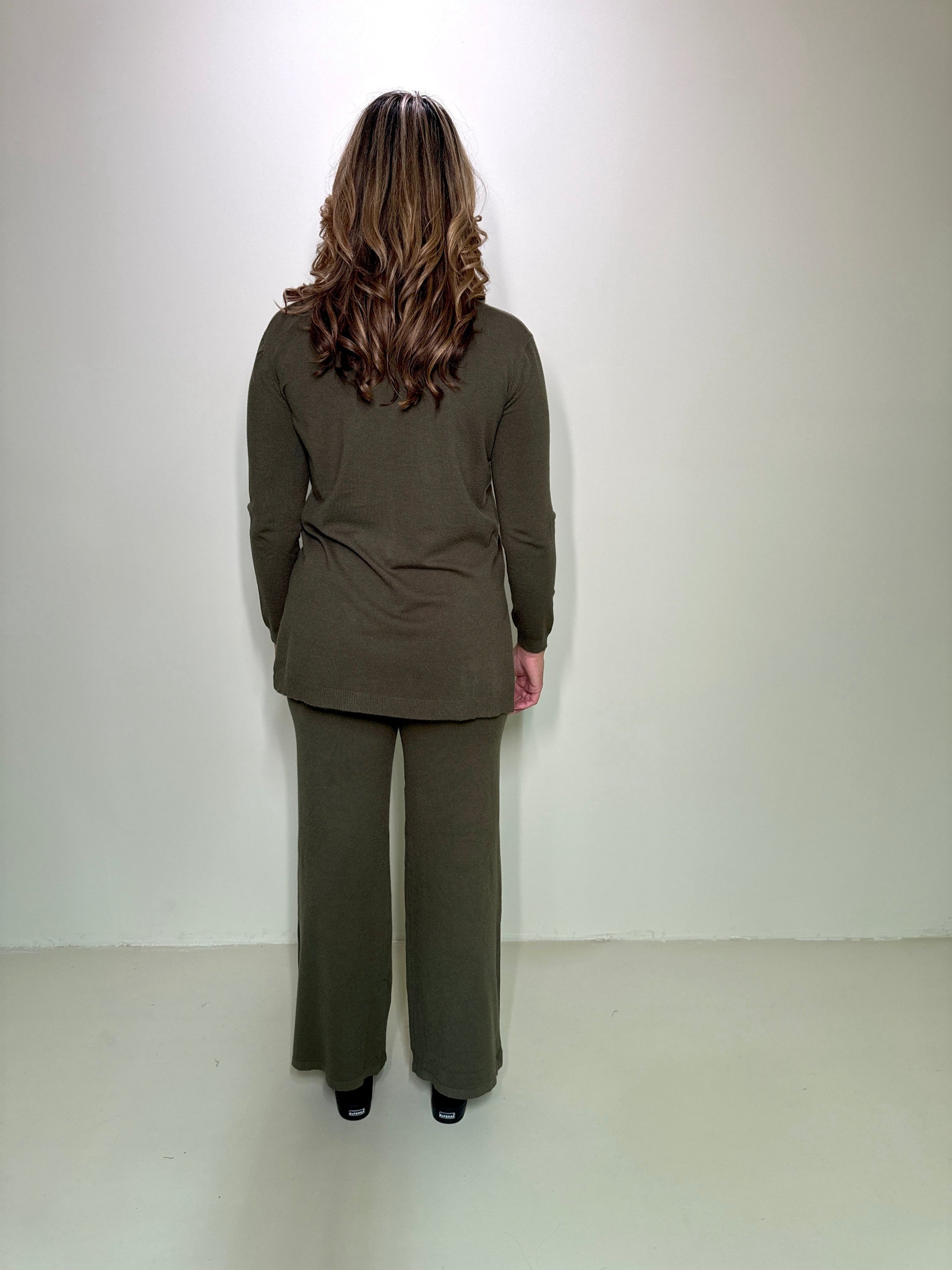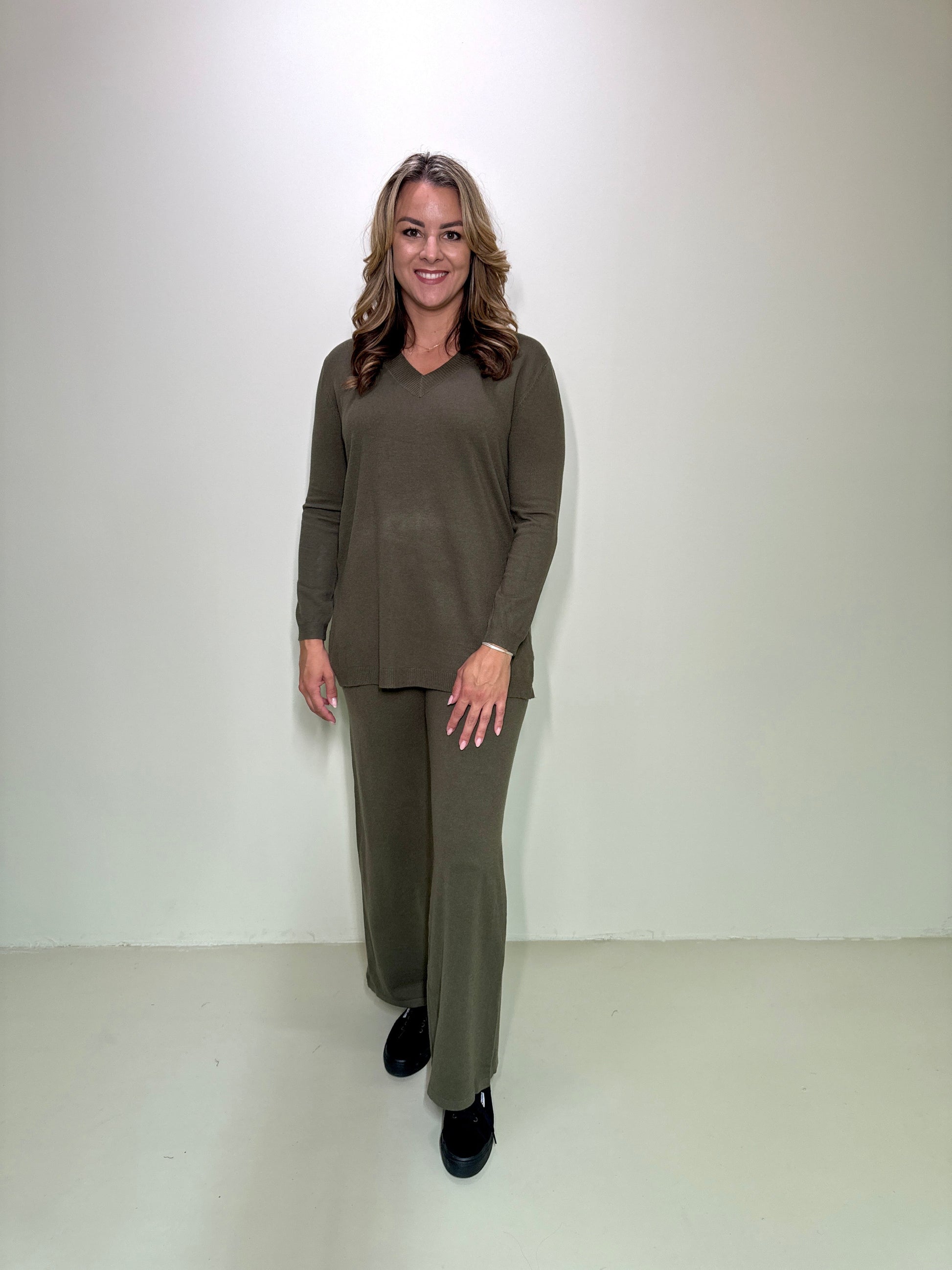 GET COMFY! De set is heerlijk zacht en bevat veel stretch. De broek heeft rechte pijpen en een fijne stretch band. De trui heeft een mooie V-hals en splitjes aan de zijkant.